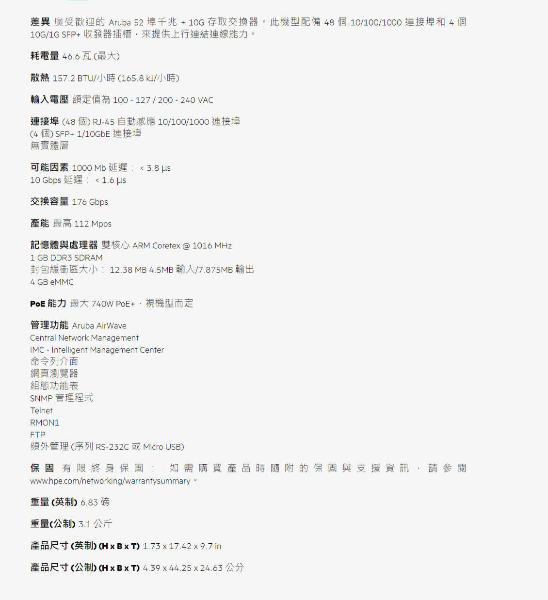 Aruba 2930F 48G 4SFP Switch 48埠網管型網路交換器(JL260A)
