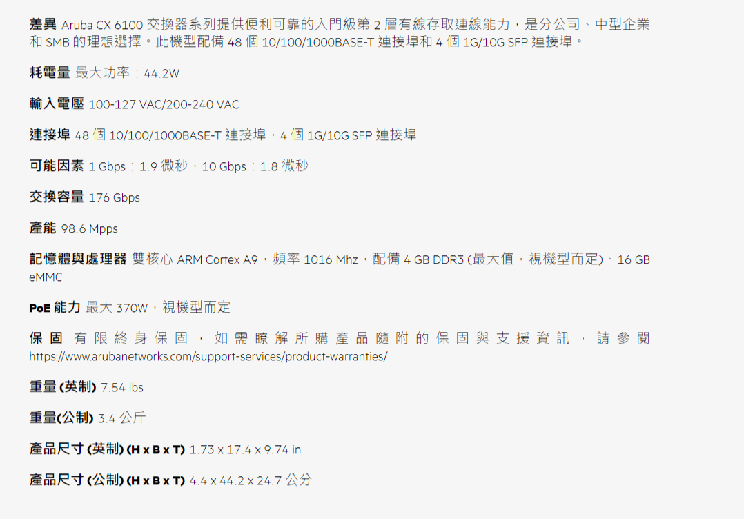 Aruba 6100 48G CL4 4SFP+ Switch 48埠網路交換器(JL675A)