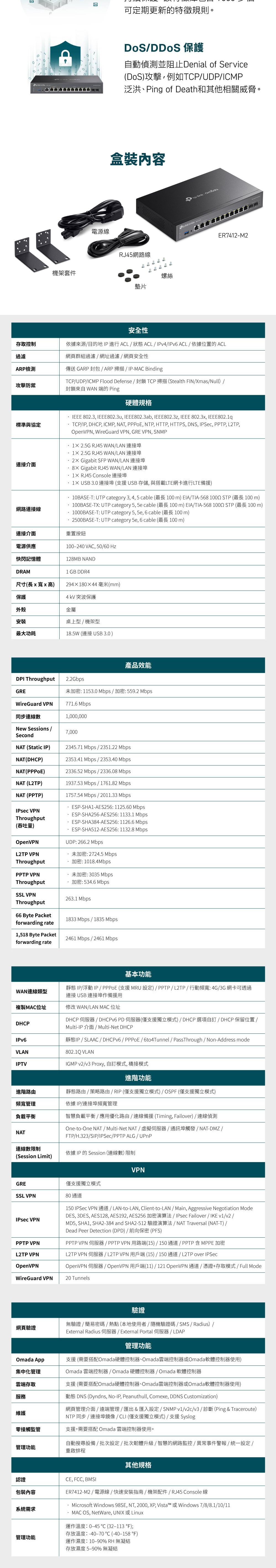 • TCP/IP、DHCP、ICMP、NAT、PPPoE、NTP、HTTP、HTTPS、DNS、IPSec、PPTP、L2TP、OpenVPN、SNMP、WireGuard VPN、GRE VPN、SNMP