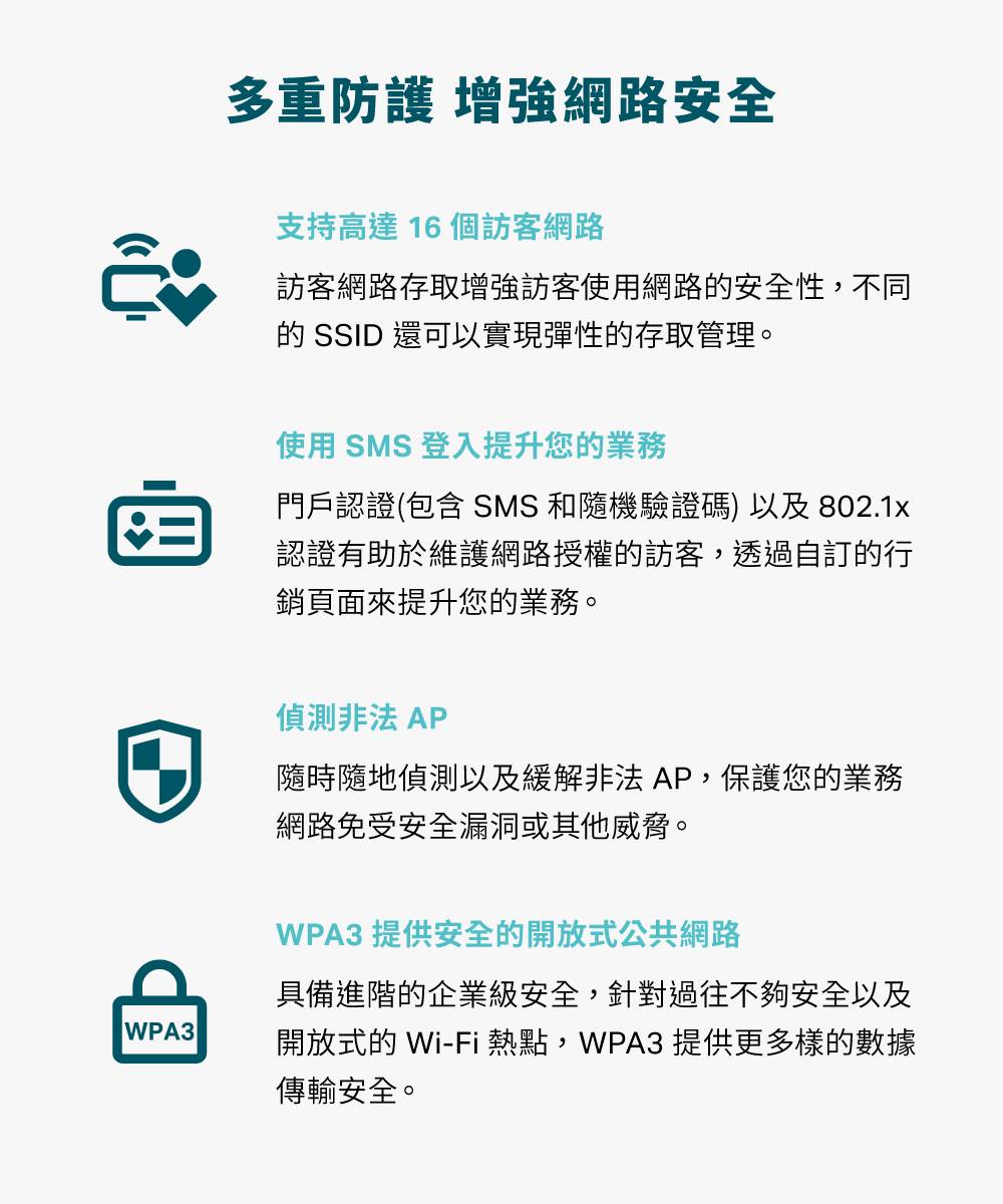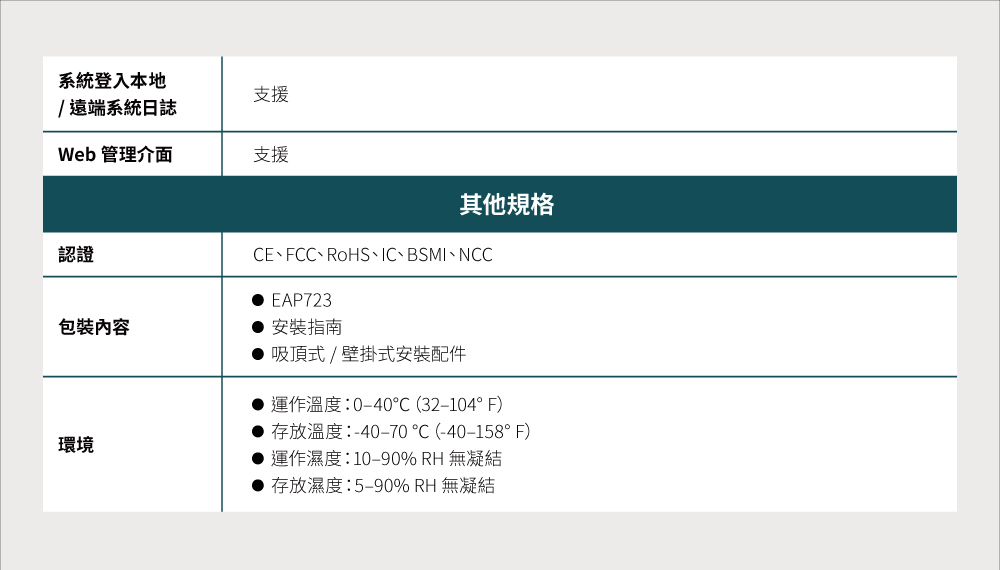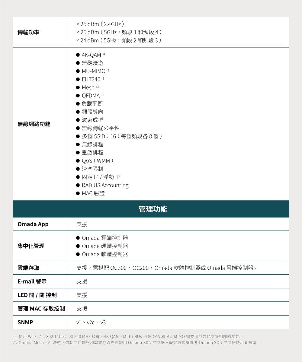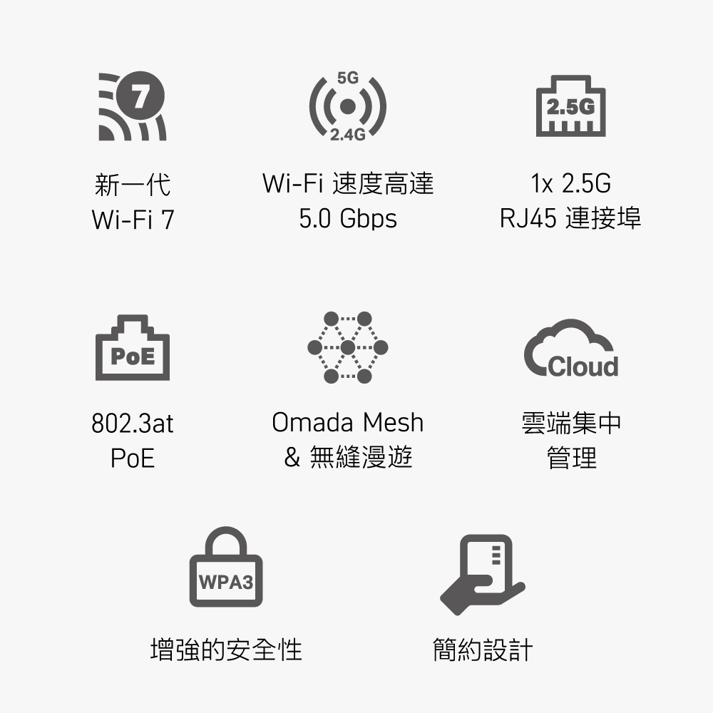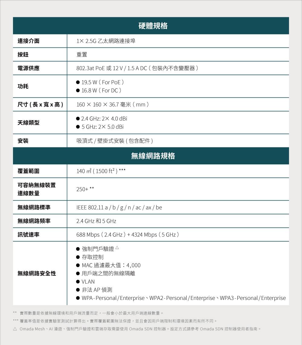 連接介面:1× 2.5G 乙太網路連接埠 電源供應:802.3at PoE 或 12 V / 1.5 A DC(包裝內不含變壓器) 功耗: • 19.5 W(For PoE) • 16.8 W(For DC) 尺寸(長 x 寬 x 高):160 × 160 × 36.7 毫米(mm) 天線: • 2.4 GHz:2× 3.0 dBi • 5 GHz:2× 3.0 dBi 安裝:吸頂式 / 壁掛式安裝(包含配件)
