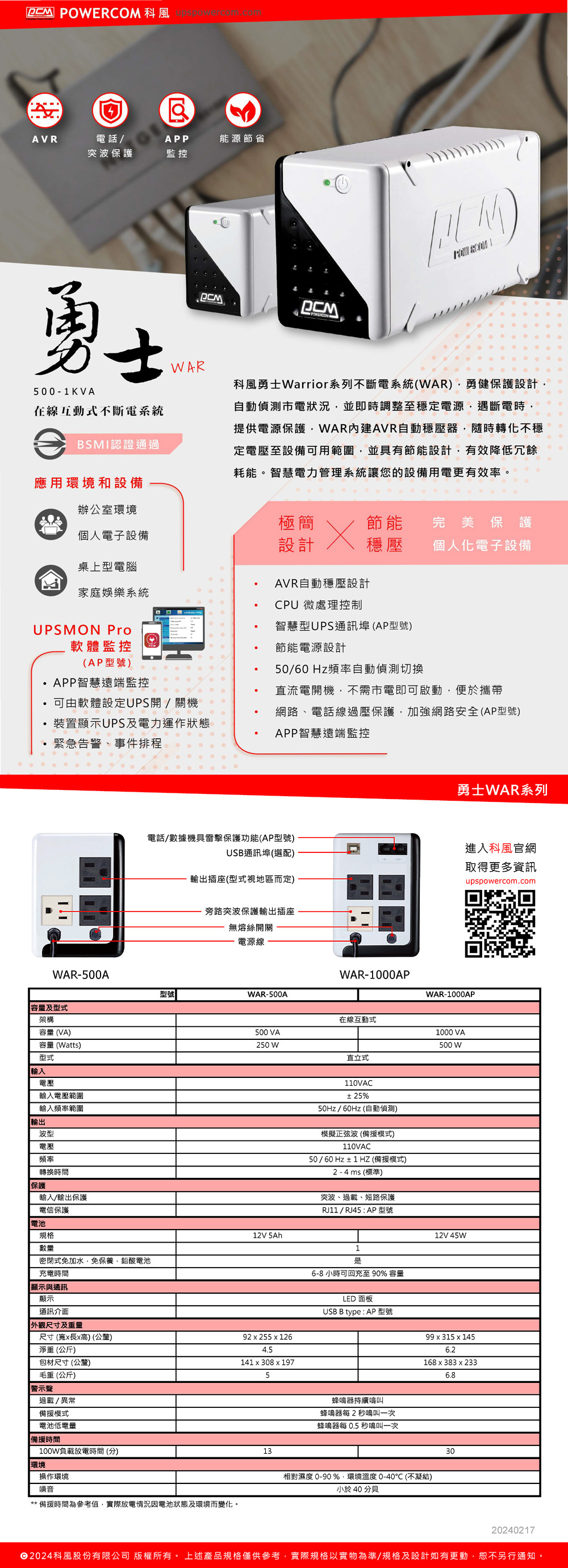 突波雷擊防護: 有 (突波保護、過載及短路保護)